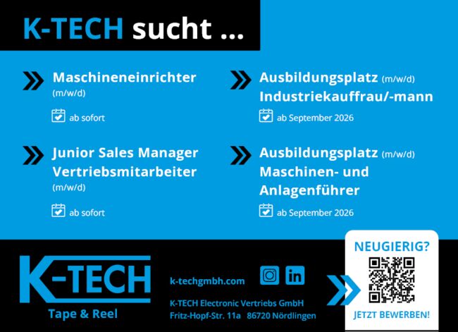 Die K-TECH Electronic Vertriebs GmbH in Nördlingen steht seit drei Jahrzehnten für Kompetenz, Verlässlichkeit und kontinuierliche Weiterentwicklung im Bereich Tape & Reel. Mit viel Engagement, Fachwissen und dem Mut, neue Wege zu gehen, hat sich das Unternehmen Schritt für Schritt zu einem geschätzten Partner für Kunden und Lieferanten entwickelt. Vom bescheidenen Start im Eigenheim bis zum modernen Neubau steht dieser Weg für Wachstum, Beständigkeit und Innovationskraft. Mit mittlerweile 50 Mitarbeitern und einer eigenen Blistergurt-Produktion mit 14 Maschinen am Standort in Nördlingen steht K-TECH heute für höchste Qualität und ist bestens für die Zukunft aufgestellt.